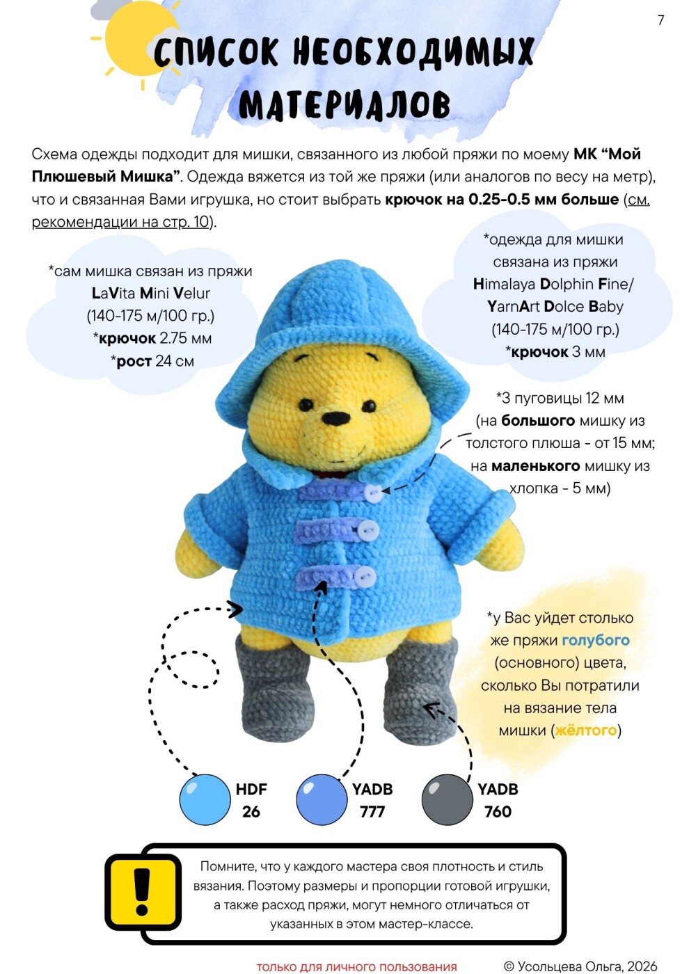 ✔ Для одежды: пряжа той же толщины, что и для мишки (или аналог по весу на метр) + крючок на 0,25–0,5 мм больше.