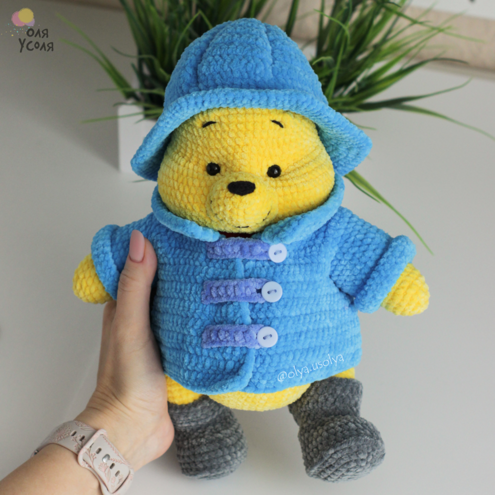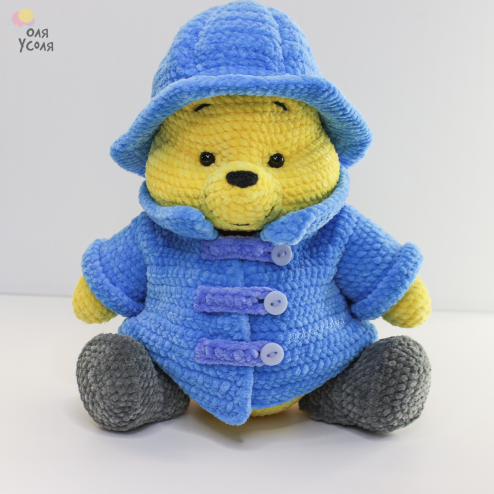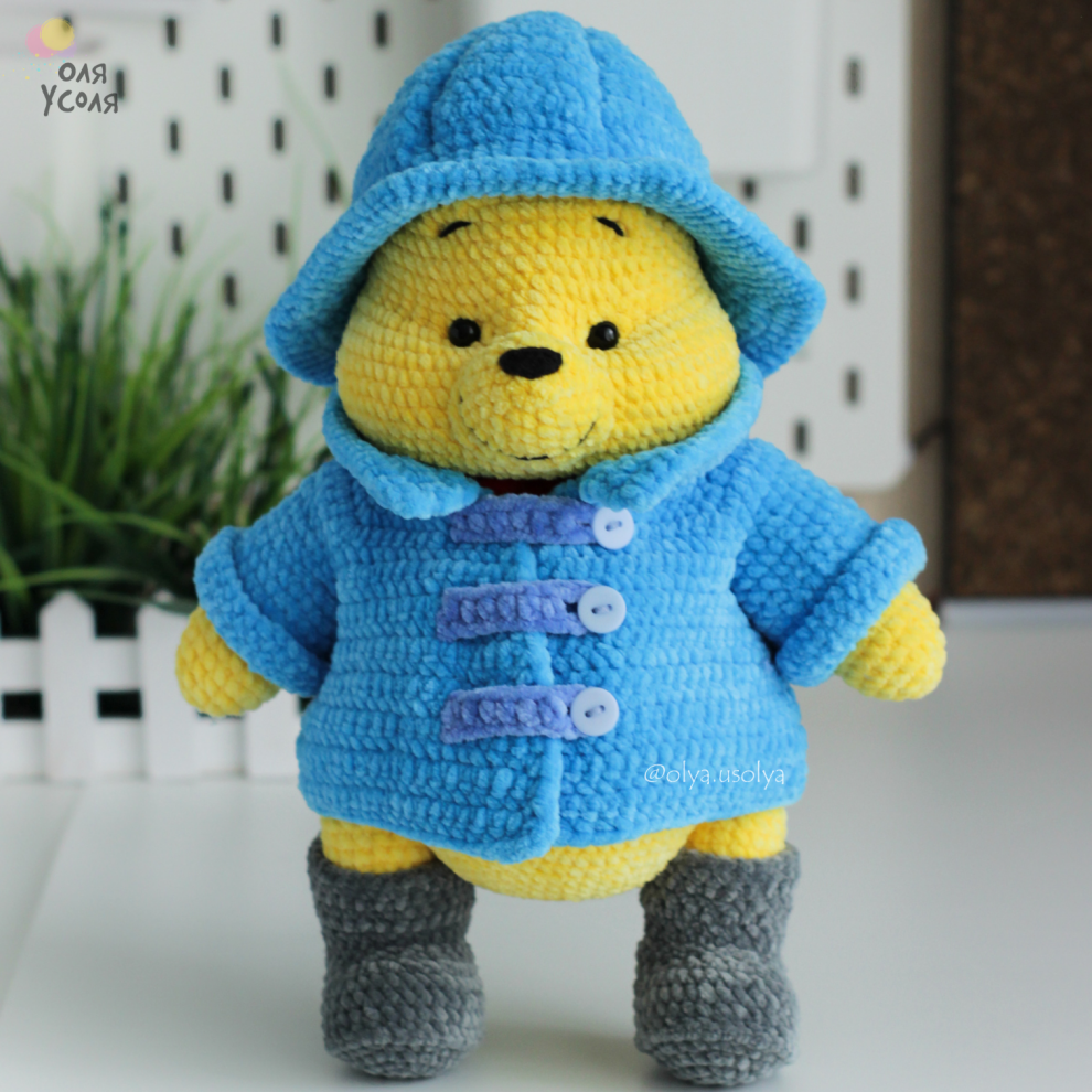 Свяжите мишку и сразу «оденьте» его в тот самый дождевой образ: шляпа-зюйдвестка, дождевик и ботинки. Получается очень кинематографично и по-домашнему уютно: такого мишку приятно посадить под ёлку, на полку или рядом с подарками.